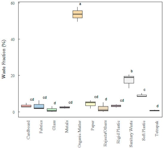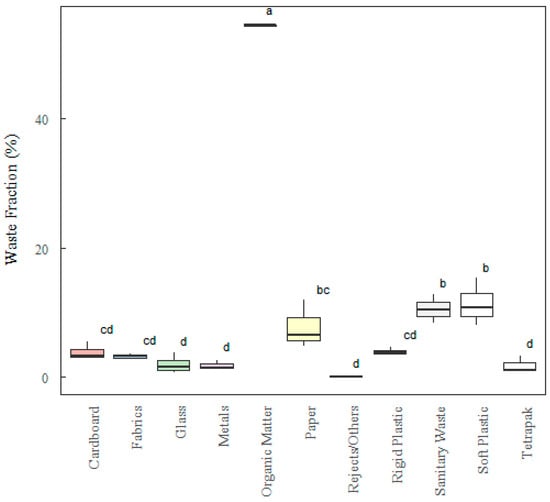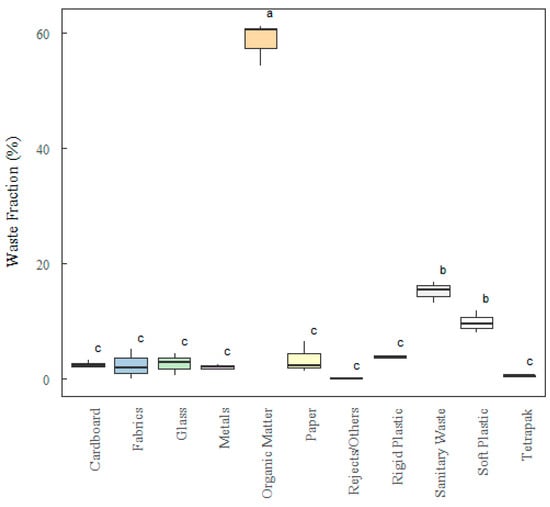 In relation to the results in Table 3, a greater deviation can be seen in the values referring to the fractions of paper ± 3.28, malleable plastic ± 2.38, organic matter ± 3.62, and sanitary waste ± 3.91. Lower values were found for the fractions of rigid plastic ± 0.65, metal ± 0.66, Tetra Pak ± 0.90, and cardboard ± 1.16. The heterogeneity of waste fractions across sectors makes the statistical data very sensitive to changes and the presence of outliers.