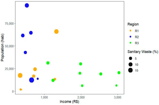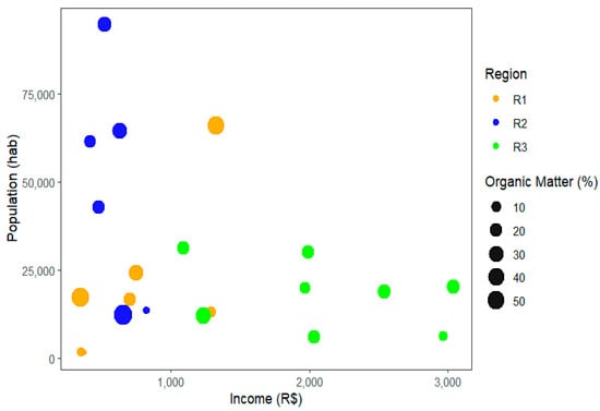 Due to the economic diversity between neighborhoods in the same region, it was decided to carry out an analysis based exclusively on this factor, considering the organic matter fraction, which stood out significantly among the fractions of urban solid waste collected. In Figure 10, the results of household income in the neighborhoods of the city of Belém/PA are graphically represented compared with the average nominal income from data from (IBGE, 2010) [] and the fractions of organics collected from regions 1, 2, and 3, and classes E, D, and C, respectively. In general, higher incomes may be associated with greater waste generation. However, the sectors with higher incomes had lower organic fraction generation and a smaller population. It was observed that in region 1, income was less than R$1000, however, the fraction of organic matter did not grow with the increase in population. While in region 2, where income was less than R$1.500, the fraction of organic matter varied between 10% and 50%. In region 3, income varied between BRL 1.000 and BRL 3.000, with a smaller number of inhabitants and smaller fractions of organic material, showing a slight tendency to reduce the fraction of organic matter with increasing income and population.
