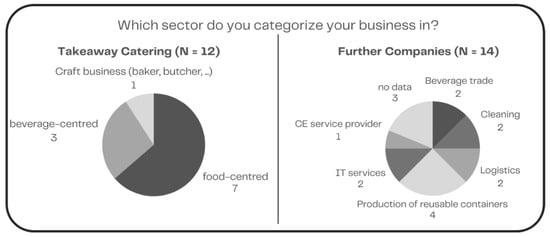 The survey of the companies included takeaway catering companies as well as other companies from the areas of logistics, IT service providers, cleaning services and system manufacturers. The questionnaire was developed on the basis of operationalized concepts and in close cooperation with the initiators of the pilot project “Mehrweg Modell Stadt”. It contains questions on the current use of reusable containers in the companies surveyed, as well as on obstacles and possible solutions for the use of reusable systems. The data were collected online between mid-January and mid-March 2024. The questionnaire was sent by e-mail to companies in the Mainz/Wiesbaden area and to various associations with the request to forward it. The mailing list consisted of approximately 300 addresses. Despite these efforts, the response rate was very low at 4% for take-away catering companies (12 participating take-away companies) and 4.7% for further companies (14 participating further companies). The data were analyzed using the SPSS statistical program []. Due to the limited sample size (12 individuals in the takeaway company group and 14 individuals in the further company group), inferential statistical analyses were not a viable option as they have low statistical power and are susceptible to bias and error probabilities. In contrast, descriptive analyses offered a comprehensive overview of the data, circumventing the methodological limitations previously discussed.