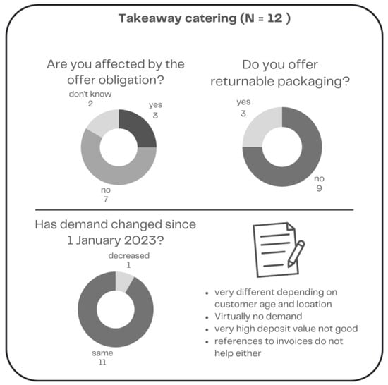 The respondent takeaway catering companies were seven micro-enterprises with fewer than 10 employees, two small enterprises (19–49 employees), one medium enterprise (50 to 250 employees), and one large enterprise with more than 250 employees (Definition based on the European Commission Recommendation (2003/361/EC) according to turnover and employee size classes). One company did not respond to this question. The majority of companies (7) were food-oriented (restaurants, pubs, snack bars, cafés, ice cream parlors []), three companies were beverage-oriented (pubs, discotheques and dance halls, bars, entertainment venues, other beverage-oriented gastronomy []), and one company was a craft business (bakery or butchery).