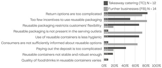 The introduction and expansion of reusable systems has been met with numerous reservations among restaurateurs and system operators. Studies by the WWF [] and the Institute for Social-Ecological Research and Education (ECOLOG) [] cite a lack of information regarding the use of reusable containers. Companies lack the capacity to deal with this issue. Language barriers and cost pressure exacerbate the problem. It is also unclear how many companies are subject to the reusable container obligation. If only the number of employees is taken as a criterion, 38.6% of companies are affected by the obligation. No reliable figures can be found based on sales area [,]. Looking deeper into the cost pressures, the costs for companies are simply too high, due to limited storage options, logistical challenges at peak times and the need to book deposits. Catering companies in particular also struggle with providing reusable food containers. Finally, many of the companies surveyed in both studies also report low customer demand for returnable containers.