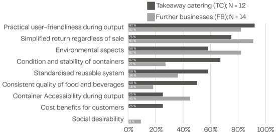 The two most important issues for both stakeholder groups were practical usability for serving operations, such as stackability (92% TC and 82% FC), and simplified return regardless of sale (75% for TC and 91% for FC). Environmental aspects such as waste avoidance, climate protection and resource conservation were a high priority for further companies in particular (82%), while only 58% of catering companies considered this aspect to be particularly important. The quality and stability of the containers played an important role for restaurants (67%), while only 27% of further companies emphasized this aspect. A uniform reusable system for all was supported by 58% of restaurants and 36% of further companies. Consistent perceived quality was important for 50% of restaurants and 18% of further companies. Social desirability, on the other hand, played little to no role for the respondents.