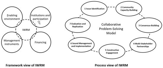 The two functions of IWRM can be diagrammed to illustrate their differences and how they respond to the diverse needs of water-related situations and conditions. Figure 1 illustrates the framework function on the left and the process function on the right. The framework concept is taken from the GWP’s explanation on its Action Hub [34] and is identical to the way that its Technical Committee has evolved the classification of IWRM tools. The dashed line indicates that the four elements are connected by IWRM. The process version is taken from a concept expressed by the US Environmental Protection Agency for a collaborative problem-solving process that can be used in environmental justice situations [46] and follows the general sequence that has proved useful in diverse situations. The dashed line indicates the general sequence of the process. The two functions of IWRM have shared features in their intent to promote both the development and management of water, land, and related resources, where the nexus examples can be natural assets like forests and fisheries, or they could be socio-economic assets, like job-producing industries [3].