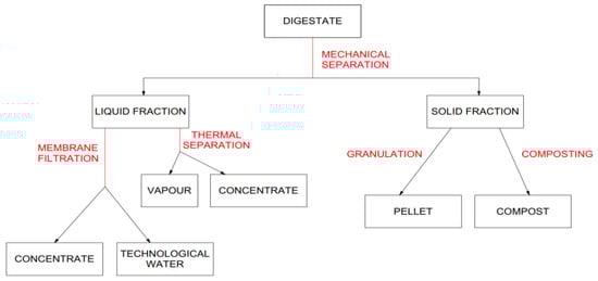 For several decades, methods have been developed to manage the digestate rationally. Depending on the chosen technology, in most cases, the first step is to separate the pulp [39]. The choice of subsequent solutions depends on many factors, such as potential recipients of the processed product or technological possibilities [35].