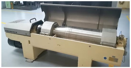 The use of centrifuges for the separation of digestate is a popular solution. They allow the separation of small solid particles contained in the hydrated fraction of the pulp [53]. Figure 3 shows the design of one type of centrifuge. The inlet at the beginning of the unit is used to feed the substrate. Unlike the press, the centrifuge is filled in the center of the centrifuge. As a result of high rotations, a centrifugal force is created, which distributes the solid particles (heavier) around the perimeter, while the liquid fraction is discharged in the rear and central parts [42]. Thus, the principle of centrifuge operation is based on the phenomenon of centrifugal force, which separates heavier solid particles from lighter liquid ones. Compared to presses, they require higher financial and operating expenditures. Against the background of various manufacturers, horizontal and vertical types of centrifuges are distinguished.