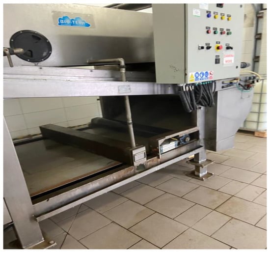 A belt filter press can be an alternative solution to the centrifuge and screw press for separating digestate. A schematic of the construction and separation process is shown in Figure 4. It consists of a filter belt made of suitable fabrics, which is banded around various-sized rollers. The digestate is applied continuously to the belt at the initial stage, and its initial dewatering occurs using gravity. After the initial drainage of part of the liquid fraction, further separation takes place. The material is applied between two filters and moved under pressure exerted by the rollers until it is removed. By adjusting the pressure force, it is possible to achieve preset values for the final hydration of the product. To reuse the tape, it is necessary to clean it. Processing of digestate on belt filter presses often requires an additive that facilitates particle separation, and it is necessary when improving the efficiency of further separation of the liquid fraction by flocculation methods. The advantages of belt filters in specific variants include higher efficiency than a screw press. Compared to centrifuges, this type of separation is characterized by lower energy consumption averaging 1.5 to 2 kWh·m−3 [42]. The main and primary disadvantage of such a solution determining its lower popularity among the discussed separation methods is the required large amount of agents for the precipitation reaction [42].
