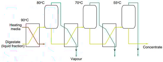 Multistage evaporation process of the liquid fraction of the digestate (own elaboration based on [55]).