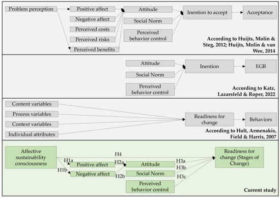 In summary, we assume that affective environmental consciousness influences the affect, that the affect influences the attitude, and that this, along with social norms and perceived behavioral control, influences readiness for change. This also means that affective environmental consciousness should be related to readiness for change. We expect that affective environmental consciousness will influence the stages of change. The higher the affective environmental consciousness, the more advanced stages of change are expected (H4).
