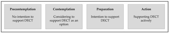 Furthermore, the Transtheoretical Model assumes that the stages are changeable and that people can move from the precontemplation phase to the contemplation phase, for example [41]. This means that their actual behavior is likely to adjust as well. This would mean that people in the precontemplation phase, for example, can develop into the action stage over time through increased environmental consciousness and thus actively support DECT.