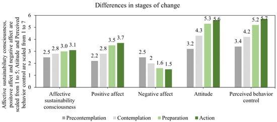The descriptive results show that affective environmental consciousness, positive affect, attitude, and perceived behavioral control generally increase as the stages of change progress, while negative affect decreases as the stages progress. This means that people in the action phase, for example, on average, have the highest affective environmental consciousness. Additional analyses show that people in different stages of change differ significantly in affective environmental consciousness, positive affect, negative affect, attitude, and perceived behavioral control.
