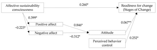 The hypothetical path model shows a significant difference from the observed model with χ2 ≤ 0.05. Due to the limited interpretability of this test, additional fit indices were captured, which, by incorporating factors such as model complexity and sample size, offer a more realistic representation of how well the model fits the data. The fit indices show excellent values with CFI ≥ 0.95, RMSEA ≤ 0.05, and SRMR ≤ 0.05 [40]. Figure 4 and Table 2 show the results of the path model. Affective environmental consciousness has a significant influence on positive affect (γ = 0.399, p ≤ 0.05) and negative affect (γ = −0.223, p ≤ 0.05). Positive affect, in turn, has a significant influence on attitude (γ = 0.846, p ≤ 0.05), and negative affect also significantly influences attitude (γ = −0.312, p ≤ 0.05). Attitude has a significant impact on the stages of change with an alpha level of p ≤ 0.1 (γ = 0.067, p = 0.073). The stages of change are also significantly influenced by perceived behavioral control (γ = 0.252, p ≤ 0.05).