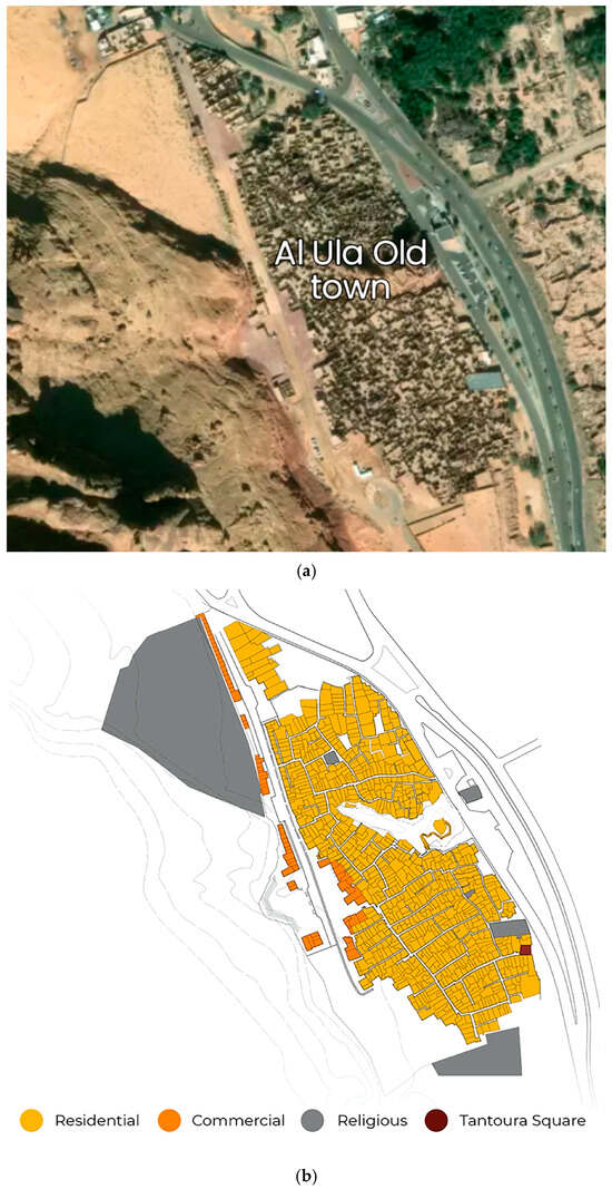 (a) Top view of Al-Ula Old Village (Google Earth Maps, 2023). (b) Overall master plan. Source: [26].