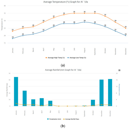 (a) Monthly average temperature in Al-Ula; (b) monthly average rainfall. Source: [28].