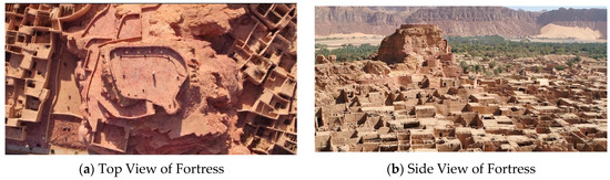 Figure 9a,b show that the Fortress of Musa bin Nasir is located on top of the rocky massif (Jabal Umm Nasir) in the middle of the Al-Deira neighborhood, located at the eastern end of the village and overlooking the agricultural area (Al-Basateen), as shown in Figure 9b. The ancestral inhabitants of Al-Ula chose this location because it serves the fortress’s protective function over the town. The fortress is built of sandstone and ascends to the heritage village through a staircase built of stone. It was stated that building the fortress on a hill overlooking the town (Al-Deira) was one of the methods used to defend and protect the village from dangers. This fortress was attributed to the Muslim leader Musa bin Nasir.
