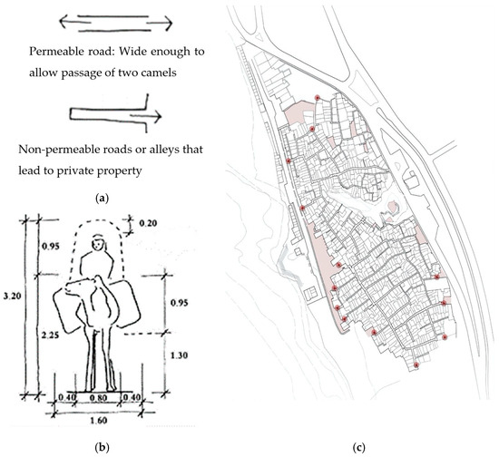Figure 10. (a–c) Road types, dimensions, and network. (a) Permeable and non-permeable alleys. (b) Maximum width and height for roads. (c) Road and alley network. (Red dots are the village’s entrances to allies). Source: [30]. - Non-permeable roads (with closed ends) are roads for a group of buildings, and houses on both sides of those roads serve a group of common properties and may not allow the passage of animals loaded with luggage (Figure 10a,b). Such roads have several features: