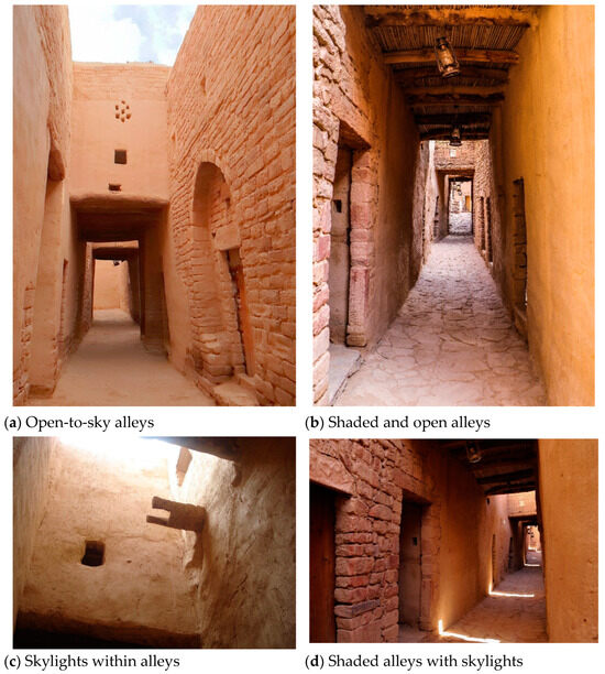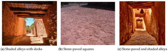 The alleys are long, winding, and narrow; some permeate each other and are roofed, except for some parts that allow the entry of light and air, and their width ranges between two and three meters. The broken lines of pedestrian corridors discourage the movement of winds inside them, in addition to providing a degree of shade and natural protection inside the corridors. The efficiency of these corridors increases when they become roofed or semi-roofed, as they provide natural protection for pedestrians from direct sunlight or protection from dust suspended in the atmosphere. In the alleys, shown in Figure 10a, there are decks where people sit, exchange conversations, and buy and sell items. Most of the alleys were paved with stone, reducing the risk of dust from the heated floor, as shown in Figure 12a–c.