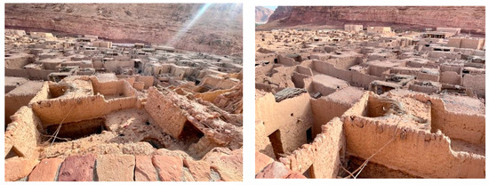 Al-Ula Heritage Village is a typical Arabian village where people from the oasis lived until the 20th century and relocated some eight decades ago due to economic, environmental, and social factors that prompted residents to seek better opportunities and living conditions elsewhere. It was built on an elevated valley area to prevent damage from potential floods in the rainy season. The village had more than 1000 houses built adjacent to each other at its highest expansion, creating a wall-like structure around the city to protect the population because of the proximity and crowdedness of dwellings. It is in the Wadi Al-Qura, a north–south-oriented valley between the Harrat ‘Uwayrid lava fields on the west and the Jibal Ath-Thumayid sandstone massif. This valley played a significant role because of its underground water supplies that sustain the growth of crops, palm trees, and other vegetation and its strategic position along the center road (Figure 4).