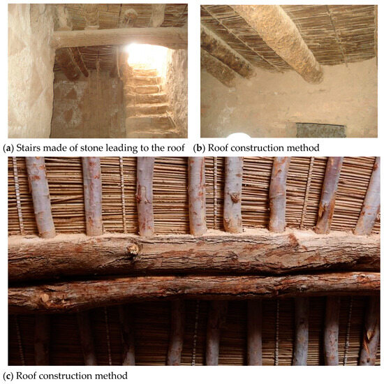 The dwellings are built with the resources available in the area. The most important are the stones cut from the mountain and the loamy soil from which bricks are made and used after drying in the sun (see Figure 15a–c). The thickness of the brick-bearing walls can reach up to 80 cm. The internal partitions, built of mud mixed with reeds, are less thick. The roof is made of palm trunks. Palm trunks can be divided into four parts according to the need and are placed on the load-bearing wall at distances of 80 to 120 cm. Monolithic boards of palm trunks or reed mats are placed on the trunks, followed by up to two clay layers. The dimensions of the rooms and corridors are determined according to the lengths of the palm trunks after they are cut. The dwellings consist of two levels connected by a narrow staircase made of mudstone.