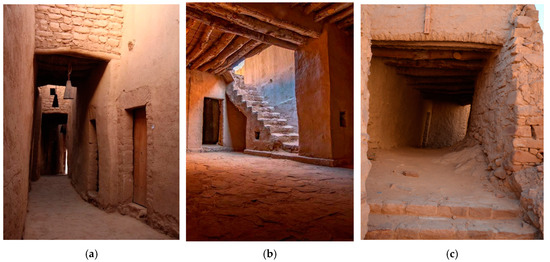 The dense urban fabric of the old village of Al-Ula, also known as Al-Deira, is composed of two historic neighborhoods: the Al-Halaf Quarter, south of the Citadel “Qalat Mussa Ibn Nussair”, and the Ashqaiq Quarter, north of the Citadel (see Figure 2a,b). The urban area spans 67,286 square meters and includes 908 housing units and public buildings connected by narrow paths (see Figure 3b), totaling over 3135 linear meters, and around 260 covered lanes, such as Tayara and Skifa [25].