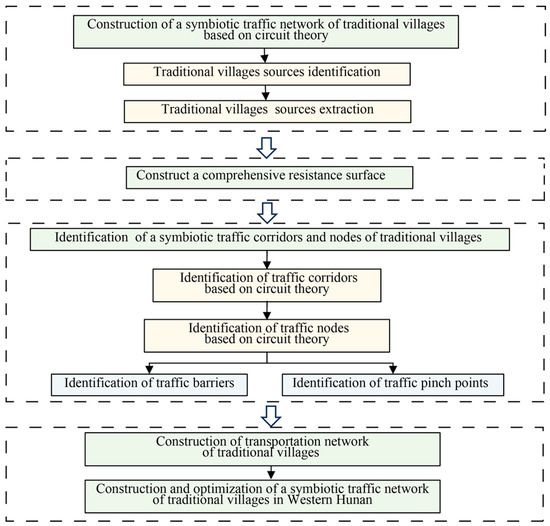 Circuit theory requires a small amount of data, can quickly identify all possible corridors, can determine the width of the different spatial positions of the corridors [21], and can reveal the key areas on the corridors, namely the pinch points and barriers. However, it also has certain limitations, such as the identification of corridor needs that should be combined with the minimum cost path (LCP). Circuit theory is a geographical information network construction method proposed by McRae in 2006 [22] that has been widely used in the construction of ecological security patterns, with its core function being the identification of ecological corridors, pinch points, and barriers. Current innovations in ecological network construction based on circuit theory have mostly focused on method optimization [23] and the identification of key areas for ecological restoration [24], and interdisciplinary applications have emerged [25]. This study applies the construction method of ecological networks to the construction of traditional village symbiotic traffic networks and provides a scientific basis for the construction of traditional village symbiotic traffic networks in Western Hunan, based on circuit theory. The research steps principally determine the traditional village sources, construct the traffic resistance surface, identify the traffic corridors, and then, based on them, identify the traffic pinch points and traffic barriers.