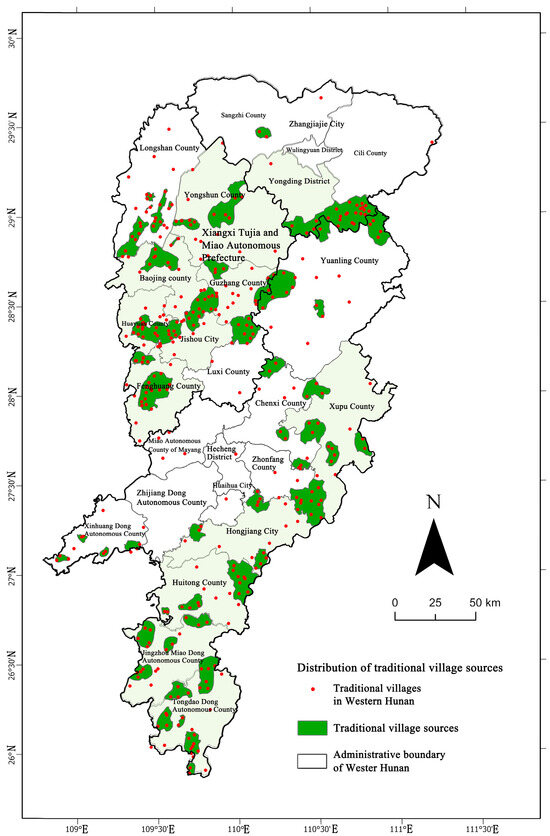 - The distribution of traditional villages was analyzed based on the spatial analysis of kernel density, and the sources of traditional villages in Western Hunan were obtained. Through the comparison of the distribution values of nuclear density with the administrative boundaries of traditional villages, 47 traditional village sources with a high connectivity value were identified. Among them, Yongding District in Zhangjiajie City, a southern traditional village source, represented the largest traditional village source. From the holistic distribution, the distribution of the sources shows the characteristics of “dense in the north and south, sparse in the middle”.