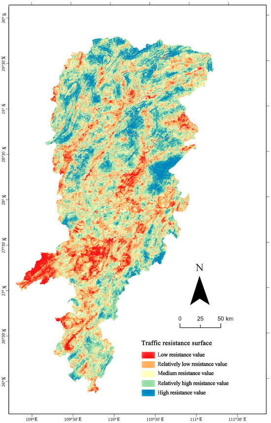 - From the two dimensions of natural conditions and traffic conditions, eight types of resistance factors were selected as the construction index of the traffic resistance surface, and weighted superposition was carried out to identify which traffic resistance surface has a significant impact on the identification of traffic corridors. The traffic resistance surfaces in Western Hunan are generally high in the north and low in the south. The natural conditions are an important factor affecting the traffic resistance values.