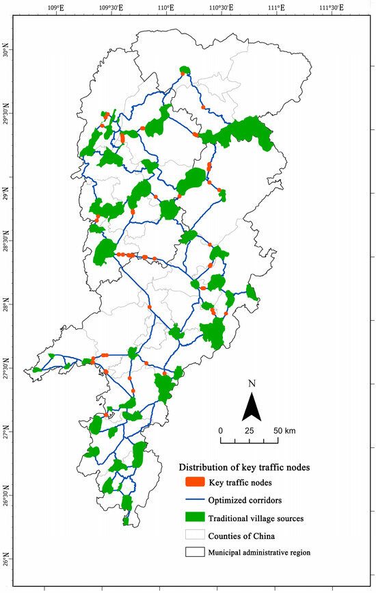 In order to strengthen the connection and exchange between traditional villages and to promote the centralized, continuous protection and utilization of traditional villages [62,63], based on the results of traffic corridor identification combined with the layout planning of the highway network in Hunan Province (2021–2050) [64] and the existing transport network, four major traffic corridor optimization principles are proposed. These aim to improve the effectiveness of connectivity between traditional village sources and thereby enhance their circulation capacity, as follows: