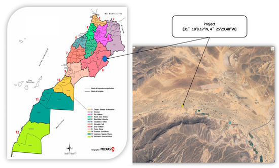 The city of Sijilmassa, nowadays called Rissani, is located in the plain of Tafilalet in the extreme south-east of Morocco. It covers approximately 8.44% of Morocco’s surface area (around 60,000 km2). The plain stretches longitudinally between latitudes 30° and 30°31′, and is crossed by the ziz and the gheris valleys, which provide the irrigation of vegetation in oases and the supply of groundwater. Ksar Tabht El khir is a village of Amazigh origin, located precisely (31°10′8.17″ N, 4°25′29.40″ W) 22 km from the centre of Rissani. Figure 1 shows the study area on maps and Morocco’s cartographic division.