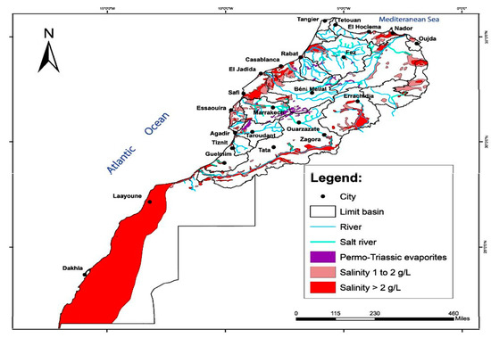 In Morocco, the surface area of soil affected by salinity is estimated at over one million hectares. In addition to saline soils, most groundwater is also saline, and its salt content exceeds 2 g/L. Figure 2 presents the distribution of saline groundwater in Morocco [33].