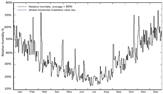 Relative humidity is an important indicator of whether a climate is dry or humid. It expresses the ratio between the quantity of water vapor present in the air and the maximum quantity that the air can contain at a given temperature. Figure 4 shows the variation in relative humidity and global horizontal irradiation throughout the year 2021 in the study area.