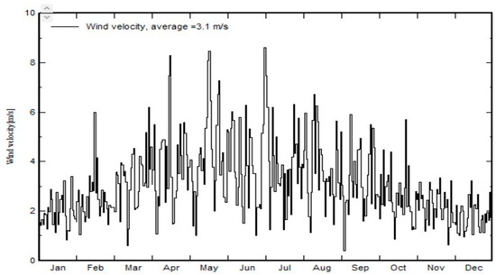 The wind is another parameter that affects the efficiency of solar panels. The average wind speed is 3.1 m/s, which varies between its minimum value of 1.9 m/s in January and December and its maximum value of 4.4 m/s in May; Figure 5 shows the wind speed in this area.