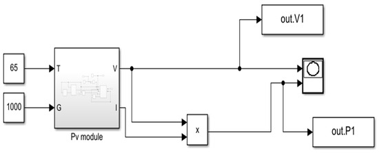 To store variables V and P, we need to create a workspace for them, which we do by setting (voltage1 = out. V1) and (power1 = out. P1) for T = 25. To run the test for T = 35, first we must change the temperature and then the V and (P) workspace in order to be able to save the result of the simulation as we do for T = 25. Figure 8 illustrates the proposed photovoltaic model configuration in Matlab-Simulink.