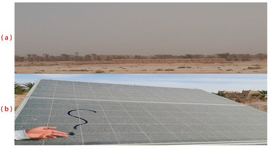 (a): the phenomenon of wind in the study area, (b): the influence of the wind dust on the photovoltaic panels.