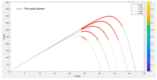 At a temperature of 25 °C (under standard conditions), we observe a maximum output of 400 Wp. However, as the temperature rises to 35 °C, production decreases to 360 Wp. Above 45 °C, the reduction continues to stabilize at 325 Wp. Above 55 °C, output is reduced to 275 Wp, and at 75 °C, it again decreases to 250 Wp. Figure 11 shows the impact of temperature on photovoltaic energy production.