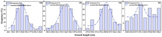The data regarding the distribution of branch lengths at various sites also showed characteristics close to those of a normal distribution. In mobile dunes, approximately 76.7% of the lengths of S. gordejevii fascicular branches were distributed between 84.0 and 154.0 cm; in semifixed dunes, approximately 82.5% of the branch lengths were between 136.0 and 182.0 cm; in fixed dunes, approximately 65.3% of the branch lengths were between 173.0 and 228.0 cm; and in interdune lowlands, approximately 80% of the branch lengths were between 224.0 and 306.0 cm.