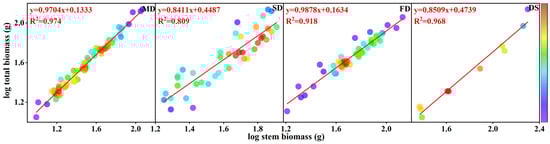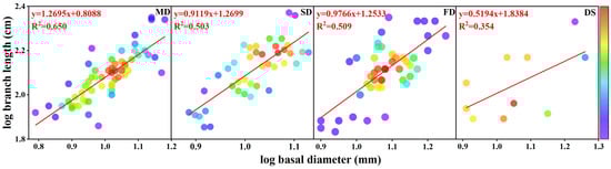 The further fitting analysis of the branch length and basal diameter data obtained under the conditions of different site types revealed slopes that ranged from 0.519 to 1.270, revealing the absence of a uniform slope applicable to all site types.