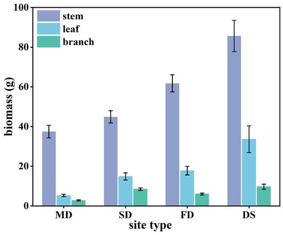 We explored the adaptability and allocation of component biomass under heterogeneous habitats. Analyzing the biomass of various components (stem, leaves, and branches) of S. gordejevii fascicular branches at different site types revealed significant differences in biomass (Figure 3). Specifically, as soil moisture content increased, the biomass of stems increased; the overall biomass of leaves also increased but decreased between fixed and semi-fixed dunes; and the biomass of branches showed an overall increasing trend.