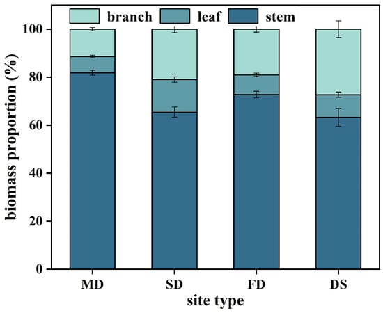 In the field of plant ecology, the allocation of biomass among different organs is a core issue [] that not only reveals the strategies of plant adaptation to environmental conditions [] and also reflects the distribution of photosynthetic products among various organs []. The optimal partitioning hypothesis suggests [] that plants prioritize resource allocation to organs that acquire limiting resources to maintain the highest growth rate [,,]. For example, under limited light conditions, biomass tends to be allocated to leaves and branches, whereas in environments limited by nutrients or water, biomass is often allocated to roots []. However, given that the proportion of biomass allocation changes with plant size [,], the application of the optimal partitioning hypothesis is limited. Allometric growth theory offers a solution to this problem [,]. It considers the effects of genetic traits and environmental factors on biomass allocation, revealing the intrinsic laws of biomass distribution among plant organs []. This theory has been widely applied in biomass allocation research [], and scholars have suggested integrating the optimal partitioning hypothesis with allometric growth theory. The biomass of plants and its allocation among various organs reflect the plant’s response to environmental resource utilization and are the basis for intraspecific differentiation strategies []. Although current research has mostly focused on different species or provenance levels [,,,], studies on intraspecific different site types remain scarce. Therefore, further exploration in this field will provide new insights to plant ecological research.