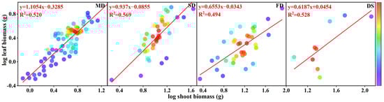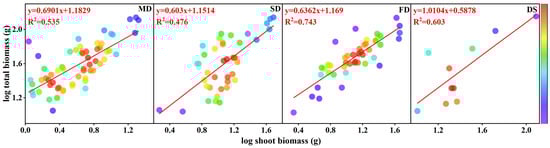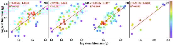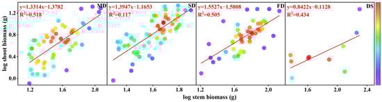 We applied the allometric growth equation y = bxa to describe the relationship between the branch length and basal diameter of S. gordejevii fascicular branches as well as the aboveground biomass (stems, leaves, and branches). By log-transforming the variables, we obtained the equation log(y) = log(b) + alog(x), ensuring that the data conformed to a normal distribution []. Here, y and x represent interdependent variables, such as stem biomass and root biomass; b is the allometric constant, which represents the intercept of the trait relationship; and a is the allometric exponent, which indicates the slope of the correlation.