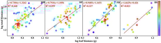 Furthermore, a correlation was found between the total and leaf biomasses of S. gordejevii fascicular branches (p < 0.01, Table 8, Figure 10). Allometric growth analysis across different site types revealed that the slope of mobile dunes was significantly lower than the theoretical value (p < 0.05), whereas the slope of interdune lowlands was significantly higher than that of other site types and the theoretical value (p < 0.05). No significant differences were found between semifixed and fixed dunes nor between their slopes and the theoretical value (p > 0.05).