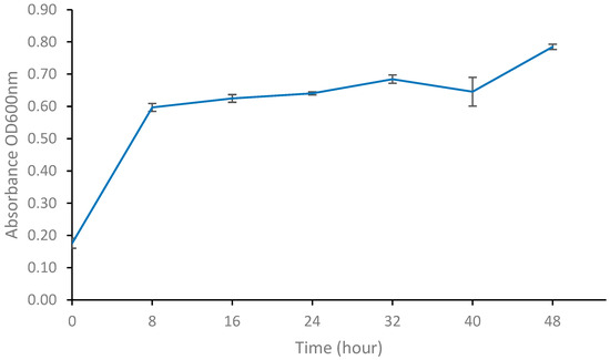 Following the preliminary experiment and the assurance that nitrogen-fixing K. oxytoca M5A1 is able to utilize hydrolysate as a carbon source during fermentation, we decided to further our experiment on the activity of hydrolysate and the response of K. oxytoca M5A1. Fermentation process was carried out at 30 °C for 48 h, under the pH of 6.5 and 200 rpm. The medium contained 10 g/L equivalent of glucose from the hydrolysate, and we monitored the growth profile of the bacterial strain with 8 h intervals for 48 h (Figure 1).