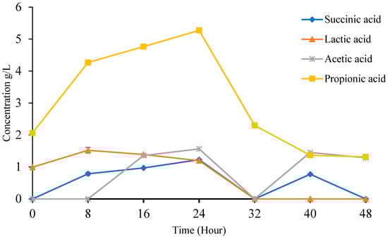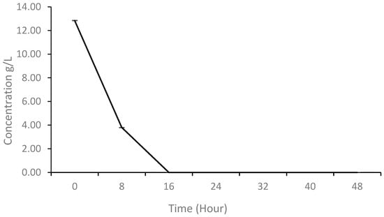 Glucose is a common carbon source for microorganisms. Research has demonstrated that the production of microbial biomass is closely linked to the availability of reducing sugars during fermentation [10]. Microorganisms assimilate glucose to build cellular components, such as amino acids, nucleotides, and other organic molecules required for growth and reproduction. Therefore, glucose utilization efficiency of K. oxytoca M5A1 is essential for the production of protein and organic acids. To ascertain whether the previously documented rapid growth correlated with the glucose utilization rate of our strain, we monitored the glucose consumption rate of K. oxytoca M5A1 utilizing an HPLC system. The samples were taken at time intervals (every 8 h) and the glucose concentration was estimated using external standards (Figure 2).