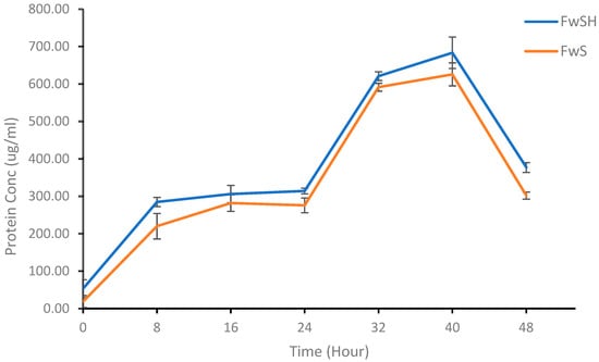MP concentration of K. oxytoca M5A1 in switchgrass hydrolysate (FwSH) and sucrose (FwS). This depicts the protein concentration produced by K. oxytoca M5A1 over time, as measured by the Bradford protein quantification assay at 595 nm. For both conditions, the graphs illustrate variations in protein concentration by highlighting an initial rapid increase from 0 to 8 h, followed by a slower rate of change between 8 and 24 h. The peak protein concentration for both conditions are observed at 40 h, with a subsequent decline by 48 h. The data are presented with mean values ± SD of n = 3 experiments. The ANOVA test at p < 0.05 confirms statistically significant differences in protein concentration at different time points.