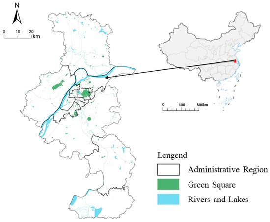 Nanjing was selected for the case study. Nanjing is the capital city of Jiangsu Province, with a total land area of 6587.1 square kilometres and an urban built-up area of 868.3 square kilometres. In 2023, Nanjing had jurisdiction over 11 municipal districts, 94 streets, and six towns. Its total population was 9.282 million, the urban population was 8.066 million, and the urbanization rate reached 86.9%. The urban built-up area of Nanjing presents a ‘circle’ spatial pattern. The inner old city covers an area of 172.3 square kilometres, including streets in the Gulou District, Qinhuai District, and Xuanwu District. The population distribution in the old urban area of Nanjing is dense, and the city is in the late stages of urban transformation and development. The main urban area around the old city covers an area of 372.8 square kilometres, including Jianye District, Qixia District, Yuhuatai District, and other streets. The new outer urban area covers an area of 323.2 square kilometres, including Jiangbei New Area, Jiangning District, and other streets (Figure 1).