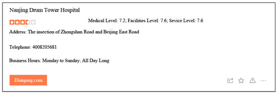 After comparing the professionalism degree, user coverage, and grading rules among different facility review websites, we chose the website named ‘Dazhongdianping’ (http://www.dianping.com/ accessed on 22 July 2023) as the data source to measure the online score of the facilities. We specifically collected the online scores of 226 medical facilities in Nanjing using a web crawler program. The online score data contained medical, facility, and service levels, and we summed the scores as the facilities’ final online evaluation scores (Figure 2). We then connected the facility addresses, microblog check-in data, and online scores using spatial location information. In cases of missing data in some community hospitals, we estimated the score using a spatial interpolation fitting method based on the scores of surrounding similar medical facilities.