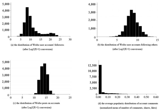 The sample data were selected from Sina microblog and Dianping. The above two websites are representative social media platforms of China’s internet [40]. At present, the number of active users exceeds 600 million, covering a wide range of people. We searched for keywords, links to website API ports, and retrieved data once a day in the morning and evening. Each time, we crawled commenter information with no more than 100 comments and performed deduplication processing. After removing failed crawling and duplicate users, we obtained the basic user group and randomly extracted high-frequency users with a published data volume greater than 500. We collected 211,377 check-in data from these users. To unify the comparison criteria, we pre-processed the data, including deleting users with a fan base of no more than 10, as well as user samples with incomplete personal information or missing profile pages, homepage closure, and failed crawling. The final check-in data for analysis was 138,572. Considering the randomness of the failure to successfully capture personal information, this will not affect the analysis results. We conducted statistical analysis on these valid sample data and performed logarithmic function transformation with a base of 2 (Figure 3). As a result, it was found that the data on the number of followers was mostly moderate to low, and it also included extremely low-, medium-, and high-scale users. ‘Pay attention to other people’s data’ and ‘number of Weibo posts’ also show a clear distribution pattern of high in the middle and low at both ends, which conforms to the overall characteristics of normal distribution. The average number of information posted by users conforms to the power-law distribution characteristics, and the sample distribution has good coverage.