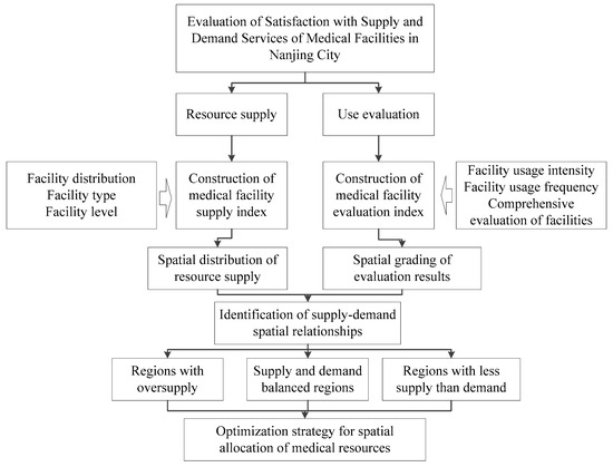 To unify the analysis unit of resource convenience, we divided the Nanjing urban area into a 1 km × 1 km grid, and the specific analysis framework is shown in Figure 4. At the level of facility supply, we selected the following three indicators to construct an evaluation system for medical facility supply: facility type, facility level, and spatial distribution. We calculated the comprehensive score of facility supply falling into the cell network as the indicator of facility supply within the geographic spatial unit. At the level of facility demand, we collected data on resident use of medical facilities from multiple dimensions, specifically selecting the following three indicators: facility usage intensity, usage evaluation rate, and comprehensive network evaluation. These were then used to construct a facility usage satisfaction evaluation index system. At the same time, we calculated the comprehensive score of facility evaluation that falls within the unit grid as an indicator of facility demand for that geographic unit. Based on unifying basic geographic units, we normalized the demand and supply indicators. This article identifies the supply and demand relationship of facilities at a spatial scale, and uses methods such as natural breakpoints to divide the facility supply index and evaluation index into the following three levels: low, medium, and high. The supply and demand levels within a unit are paired in a matrix to directly compare the relative differences between supply and demand levels. Obviously, supply and evaluation belong to the same level, which is most likely to result in supply–demand balance. The larger the level gap, the more imbalanced it becomes. In theory, the supply–demand relationship can be divided into nine states (Table 3). Finally, based on the spatial supply and demand relationship of medical resources, we take administrative jurisdiction units as the statistical scope, summarize the balance of facility supply and demand matching in each jurisdiction area, and provide targeted optimization strategies for medical resource supply in different jurisdictions.