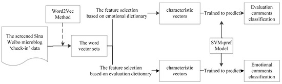 During the development of online social networks, an increasing number of people published their assessments and attitudes towards the spatial environment through online social platforms such as microblogs. We collected 19,237 microblog check-in data containing comments about medical facilities in Nanjing. After data screening and cleaning, we selected 3000 high-quality comments as the training data set. First, we trained and calculated the word vector sets using the Word2Vec model (a type of natural language processing model supplied by Google Inc.) and calculated the weight of words based on the Term Frequency Inverse Document Frequency algorithm. We then trained and classified the remaining text data using the weighted word vector and the SVM-pref model. In addition, we used a supervized machine learning method to classify the evaluation and emotional words from the entire check-in comments context. Specifically, we used the Word2Vec model to train word vector sets and cluster similar concept words by calculating the cosine distance between them. We then expanded the clustered similarity domain vocabulary to an emotional dictionary and trained a high-dimensional representation of the word vectors. Finally, we performed high-dimensional vector reduction processing using principal component analysis (PCA) and classified these vectors using the SVM-pref model. Based on the above methods, we classified the evaluation and emotional words from the check-in comments (Figure 5). After the actual test, we found that the best classification results achieved more than 90% accuracy based on the Word2Vec and SVM-pref models. The results also confirmed that this method can achieve good performance in an emotional classification task.