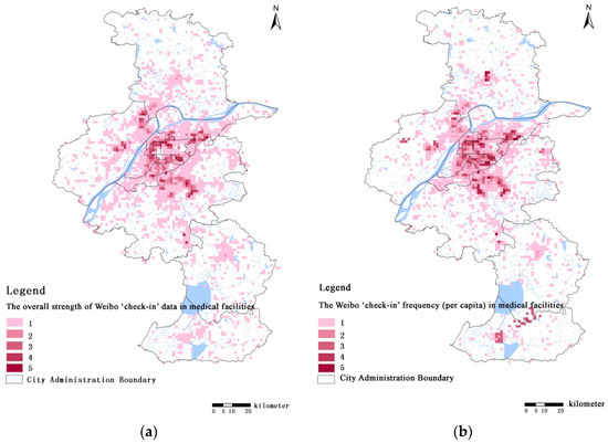 The overall intensity (a) and frequency per capita (b) of microblog ‘check-in’ data related to medical facilities in Nanjing.