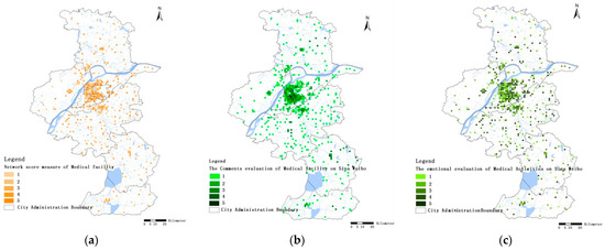 An online social networking platform is an important channel for residents to share and exchange their usage experiences in facilities. We collected online scores and comments related to medical facilities from facility review websites and microblog check-in data. Specifically, the comments contained facility usage experience and emotional attitudes among different resident groups, which also indirectly reflected residents’ satisfaction with the facilities. We built models to classify the evaluation and emotion keywords from the comments context using natural language processing and other semantic analysis methods. We also trained and recognized the evaluation and emotion keywords to measure residents’ service satisfaction with the medical facilities (Table 8). Regarding the online score, we found that high-scoring facilities were concentrated in Gulou and Qinhuai boroughs; although in other boroughs, the rating score was uniformly distributed (Figure 8a). Regarding the facility usage experience level, in addition to the high-evaluation medical facilities agglomeration downtown, the other borough received some scattered high-evaluation medical facilities (Figure 8b). Regarding the aspect of usage emotion level, we found that patients’ moods were generally low in tertiary hospitals, and generally high in small hospitals. This phenomenon is related to the major comprehensive hospitals that mainly perform diagnosis and treatment of emergency and critical diseases, and the patients’ and their families’ moods correspondingly undergo great emotional fluctuation (Figure 8c). However, small- and medium-sized hospitals mainly provide healthcare services, and the patients’ moods are relatively calm.